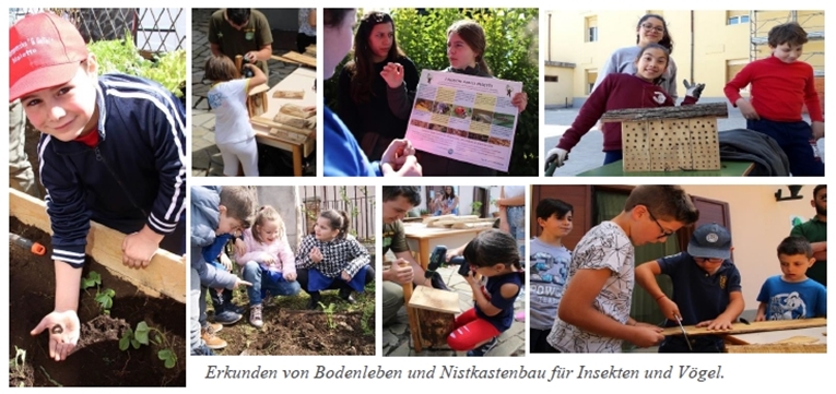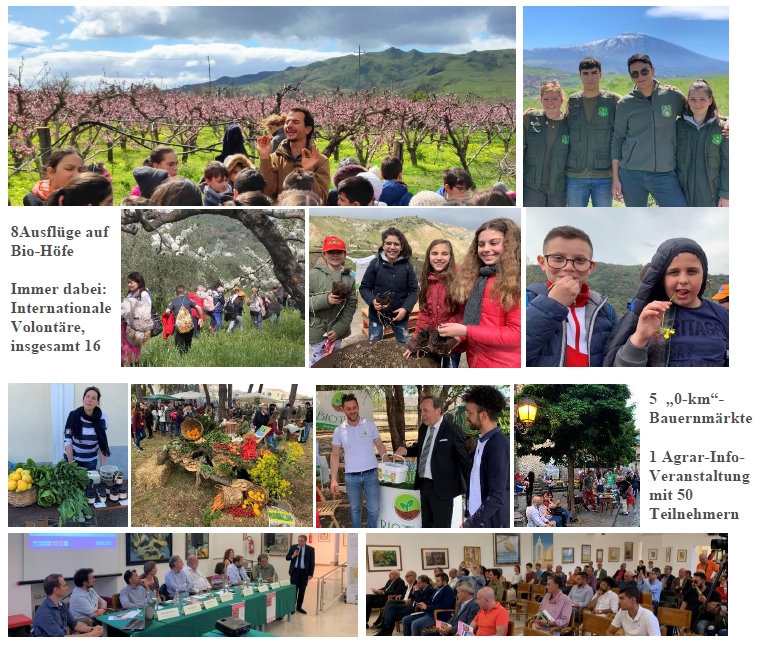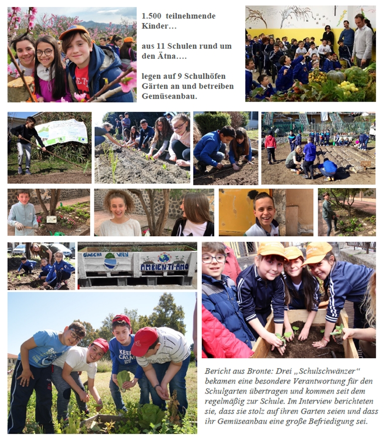 Dank eines einmaligen Zuschusses vom BMU (EUKI-Programm) konnten wir ein neues Umweltbildungsprojekt am Ätna beginnen: Es geht um Klimaschutz durch Ernährung, nach dem Motto: Lokal/ Regional/ Saisonal und – möglichst – Bio. Kern der Aktivitäten ist das Gärtnern auf Schulhöfen. Außerdem werden mit den Kindern Bauernhöfe besucht, für einige Städte Bauernmärkte organisiert und Experten-Austausch veranstaltet. Den Schulaktivitäten gehen Lektionen im Klassenzimmer voraus und bei allem helfen unsere internationalen jungen ERASMUS-Volontäre.